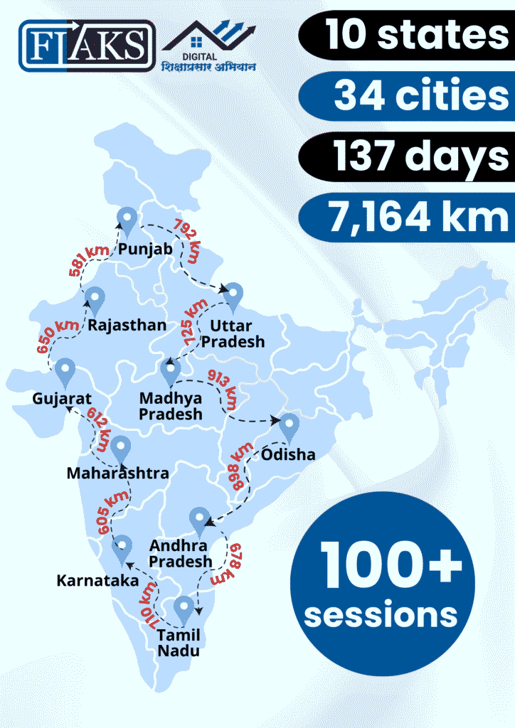 With the findings gathered from the first edition, we set out to visit 10 states, 34 cities, over 137 days covering 7,164 km via road, rail, and air for the second edition of FIAKS Digital शिक्षाप्रसार अभियान. Particularly in this second edition, we focused to train the trainers by imparting education and empowering merchants, CSP & agents of banking correspondents who are driving financial inclusion serving thousands of customers in tier 2/3/4 cities. We conducted 100+ sessions and shared knowledge on: